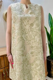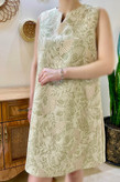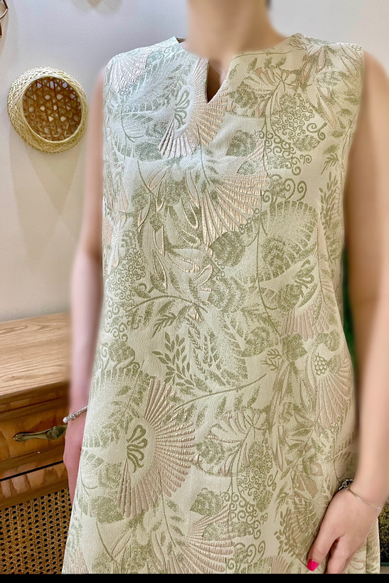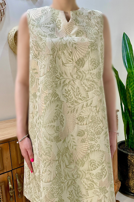 پیراهن ژاکارد با طرح برجسته انتخابی خاص، شیک و چشمنواز برای استایلهای رسمی و نیمهرسمی است. ترکیب رنگ سبز در زمینه با نقشهای برجسته بژ-طلایی، جلوهای لوکس و منحصربهفرد به این پیراهن داده است. طراحی یقه گرد با برشی خاص، فرم بدون آستین و زیپ مخفی در پشت لباس، ظاهری تمیز، مرتب و بسیار ظریف ایجاد میکند. این مدل هم برای مهمانیها و مجالس رسمی، و هم برای موقعیتهایی که به دنبال یک استایل متفاوت هستید، انتخابی فوقالعاده است.
