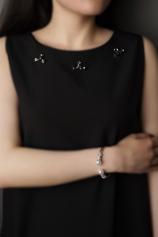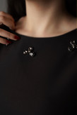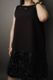 پیراهن مشکی کرپ با طراحی خاص و جزئیات چشمنواز، انتخابی شیک و متفاوت برای مهمانیها و مراسم رسمی است. قسمت پایین پیراهن از پارچه لمه ریشدار دوخته شده که حرکتی نرم و جذاب به استایل میبخشد. یقه گرد با دور یقه جواهردوزی مشکی، ظاهری ظریف و مجلل ایجاد کرده است. زیپ مخفی در پشت و آستر داخلی نیز راحتی و پوششی مناسب را تضمین میکنند. آستین حلقهای این پیراهن به زیبایی فرم آن افزوده است. این پیراهن مناسب مجالس و دورهمی های دوستانه است.