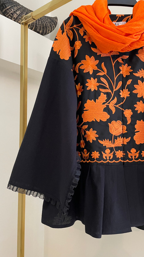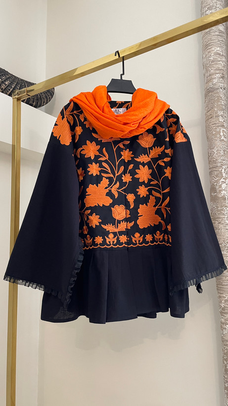 این کت یقه گرد از پارچه لینن سوزندوزی و ساده مشکی رنگ، جلوهای زیبا و چشمنواز دارد. پایین کت با پیلی طراحی شده که به استایل شما حجم و فرم خاصی میبخشد. آستینهای خاص این کت با چاک و لبههایی که نوار دوزی شدهاند، ظاهری متفاوت و مدرن ایجاد کرده است. این کت برای حضور در مراسمهای نیمهرسمی، دورهمیهای دوستانه یا استایلهای شیک روزمره انتخابی خاص و منحصر به فرد است.